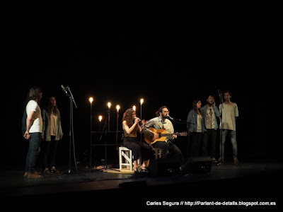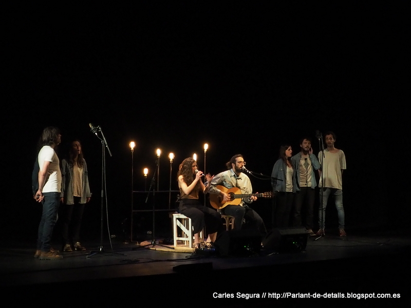 Per continuar, ens canten “Si només volgués voler-te” i “No suportem l’hivern”, que endevino força especial quan en Jet ens diu que al vídeo, que podem trobar al YouTube, apareix la seva mare. Quan escoltem “Qui som”, de l’àlbum Viatges i flors(Autoeditat) el segon tema que han recuperat per aquest espectacle escoltem, em fixo que al mig de la platea, en el passadís central, acaba de situar-se un cor que, cantant i fent palmes, han contagiat a tothom i estan donant una mica més d’alegria i vida al tendre espectacle. Després d’una ràpida presentació l’Anna Rovira, en Xevi Collado, en Pau Lafoz, la Mariona Garcia i la Berta Planes, el cor es queda amb ells a l’escenari i plegats ens canten “Lliure o descansar”, el tema homònim del disc i, “Ara és demà”, un poema del Miquel Martí i Pol musicat per en Jet, amb el que tanquen la seva actuació.