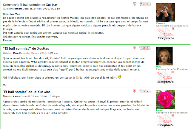 Aquella nit, se sentia diferent. Potser pel vestit, seleccionat amb tanta cura, potser perquè feia res que havia complert 15 anys. Hagués volgut que el gran espill, que tenia a l’habitació, li tornés la seva imatge com la d’una princesa, però havia vist a la mateixa de sempre, simplement enfundada en un preciós vestit. La cançó dels fanalets la va treure dels seus pensaments i una simple pregunta la va portar a la realitat: Vols ballar? Era ell, fanalet encès, que li somreia i li allargava la mà per treure-la a ballar. Estava bocabadada. No podia quasi respirar. Mentre caminaven aquells 4 passos, que li semblaven kilòmetres, notava com tothom els mirava sorpresos però, els seus somnis s’havien fet realitat i el món va deixar d’existir al seu voltant. Només la música i ell tenien sentit.