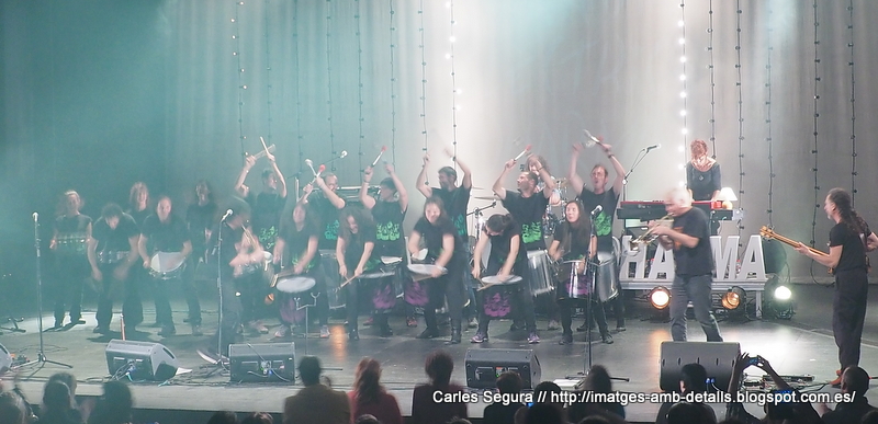 Amb el crit “Per Josep”, comença a sonar els acords de “La gent vol viure en pau” i, entre tots, van recitant els versos, mentre llums, fúcsies, els banyen. En Joan baixa de l’escenari, sense deixar de tocar el saxòfon. Es mou entre les primeres butaques. Torna a l’escenari i corre per ell de punta a punta. Salta. I per fi, després d’aquesta demostració de control de respiració i energia, aconsegueix que la gent s’aixequi dels seients, aplaudeixi, balli, salti i cridi amb ells. Ara els que arriben a l’escenari són els Tabalers de Xàldiga i plegats toquen “Festejada (de timbals)”. Ressonen els tabals i ressonen els acords. Tothom segueix en peu ballant, aplaudint, cantant. És impossible resistir-se al clima que s’ha generat i per continuar amb ell escoltem “Ronda de nit” amb la que en Joan ens presenta als músics, tot i que jo diria que és impossible que hi hagi algú que no sàpiga qui és cada un d’ells i aprofita per fer els agraïments a les entitats que han participat i als tècnics. Els llums es tornen blaus i suaus, mentre s’acomiaden al crit de “Força Dharma” que, tot i no ser ja a l’escenari, no s’apaga, sinó que cada cop sona més i més fort. I, amb el mateix crit que han marxat, tornen per fer els bisos finals.