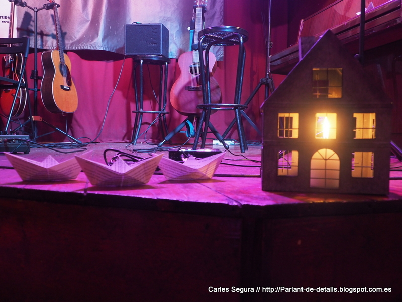 Una sala, encara buida, ens espera però, l’escenari ha captat la meva atenció: En primer pla veig una casa, que conté una espelma encesa, i 3 vaixells de paper, fets amb un full blanc ple de lletres. Darrere, en segon pla, dues cadires i dues guitarres esperen l’arribada dels músics. Amb mig somriure, encara als llavis, observo les petites taules rodones i la meva curiositat es desperta ràpidament. A totes hi ha un vaixell de paper, que abans em semblàvem només lletres, i ara veig que és un poema que es repeteix per tota la fulla. També hi ha dues espelmes i un encenedor. De seguida, em fixo en una nota escrita a mà i signada per Jordi, que aclareix el misteri: “Les podeu encendre quan soni una cançó que us agradi. Així des de dalt, ho veurem” i el meu somriure es fa més gran. Aquests petits detalls demostren l’atenció que el músic fa al seu públic i no sols a l’actuació.